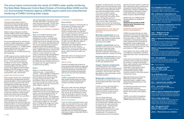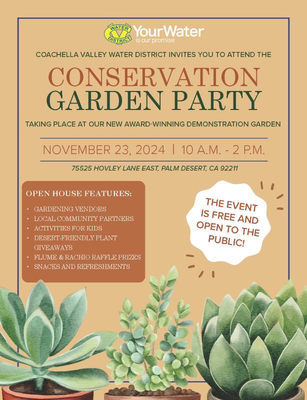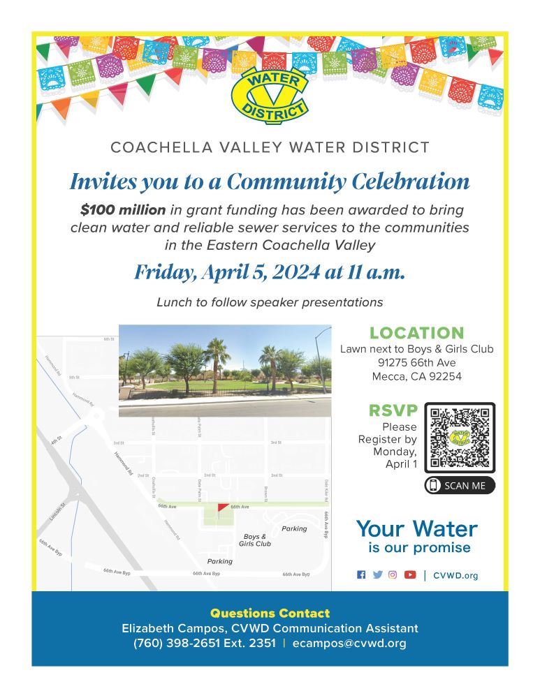 Coachella Valley Water District is a public agency governed by a five-member board of directors. The District serves the community with domestic water, agricultural irrigation and drainage, wastewater collection and treatment, nonpotable and recycled water, regional stormwater protection, groundwater management, and water conservation programs. It serves approximately 114,000 residential and business customers across 1,000 square miles, primarily in Riverside County and portions of Imperial and San Diego counties.Media Contact: Lorraine Garcia, PIOEmail: Lorraine.Garcia@cvwd.orgOffice: (760) 398-2661, ext. 2549Cell: (760) 695-4007